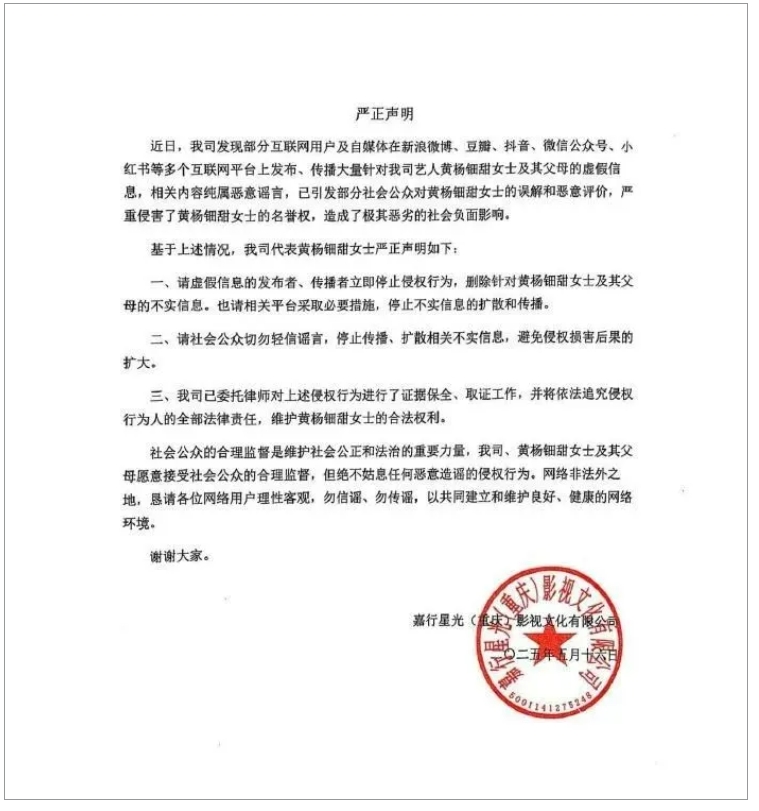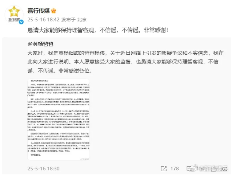 此前,@嘉行傳媒 已發佈嚴正聲明:社會公眾的合理監督是維護社會公正和法治的重要力量,我司、黃楊鈿甜女士及其父母願意接受社會公眾的合理監督,但絕不姑息任何惡意造謠的侵權行為,懇請大家勿信謠、勿傳謠。