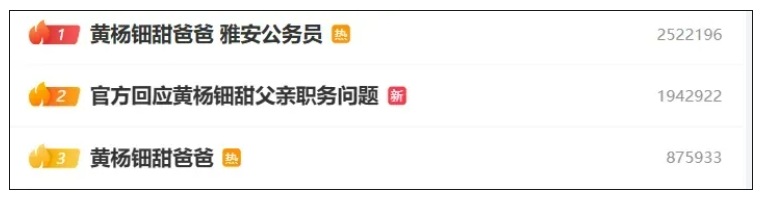 5月14日下午,網絡上有多個消息稱,黃楊鈿甜父親為四川雅安公職人員,質疑其高額消費不合理。5月15日,黃楊鈿甜相關信息多次衝上熱搜。