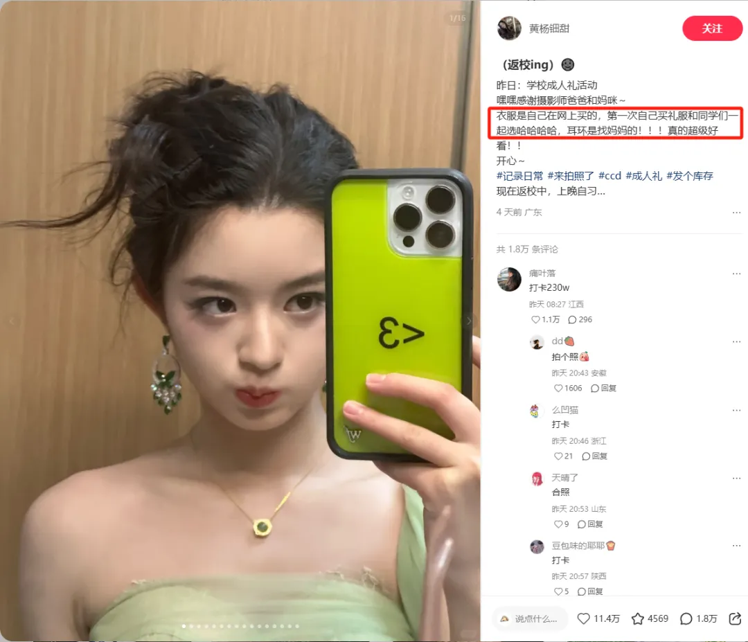 這一系列信息,源於黃楊鈿甜5月11日在社交平台上分享的成人禮照片。照片中,黃楊鈿甜佩戴的耳環被指認是奢侈品牌GRAFF經典系列,官方售價約230萬元。