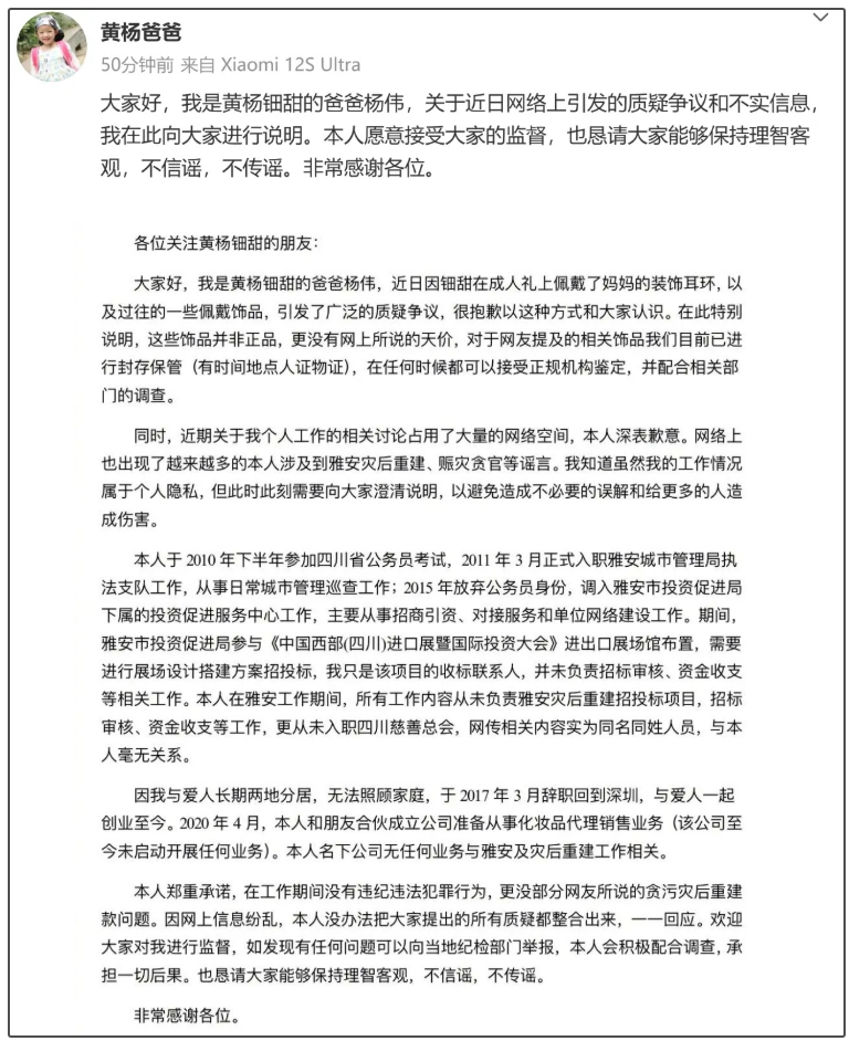 5月16日晚,女演員黃楊鈿甜父親 @黃楊爸爸 發文,回應女兒相關爭議:耳環不是正品,涉及的雅安災後重建、賑災貪官等傳言是謠言。