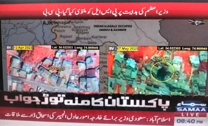 此外,在巴基斯坦的發佈會上,巴基斯坦空軍發言人還拿出了一張亞米級分辨率衞星遙感照片,證明一架戰鬥機在此處墜毀。這證明巴基斯坦在局部擁有遙感圖像優勢。