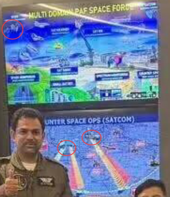 重點是,在他們後面的背景中,清晰可見“多域巴基斯坦太空部隊”(Multi Domain PAF Space Force)和“獵手太空操作-衞通”(Hunter Space Ops-SATCOM)的界面。其中“多域巴基斯坦太空部隊”的展示圖左上角有一顆衞星,應該是去年發射的“巴基斯坦多用途通信衞星一號”(Paksat-MM1R)。