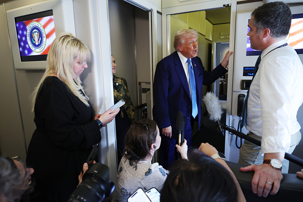 5月15日,結束對中東三國的訪問,特朗普在空軍一號上接受媒體採訪。 視覺中國