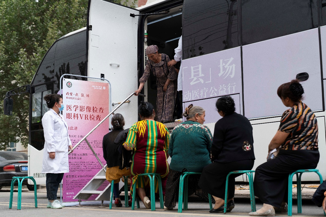 新疆喀什地區疏勒縣維吾爾族老人在車載CT前排隊等待檢查