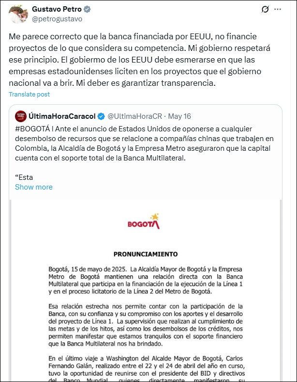 佩特羅當天在X平台上轉發了一條波哥大市政府發表的聲明。聲明提到,針對美國政府宣佈反對向任何在哥運營的中企提供資金,波哥大市政府及地鐵公司強調,首都項目已獲得多邊銀行的全面支持。