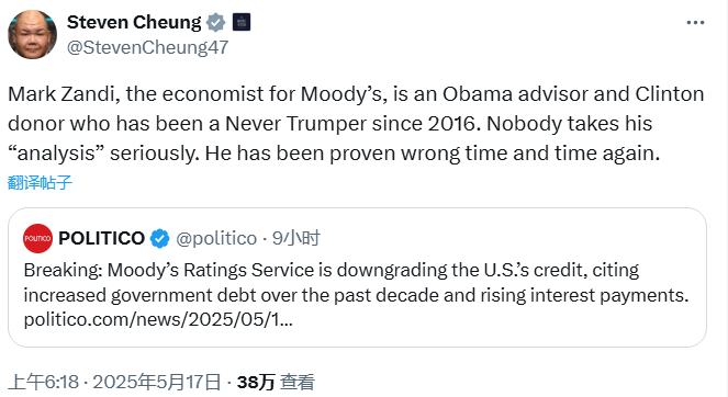 當地時間16日,國際信用評級機構穆迪宣佈下調美國主權信用評級。白宮通訊主任兼總統助理史蒂文・張當日點名抨擊穆迪首席經濟學家贊迪,認為穆迪下調評級是一項“針對特朗普”的政治決定。