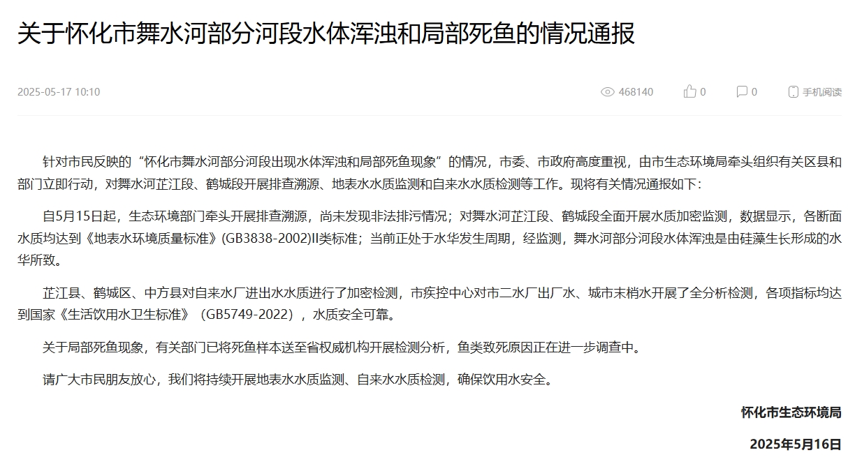 據懷化新聞網5月17日消息,懷化市生態環境局發佈了一則通報,對此前部分網友反映的“舞水河部分河段出現水體渾濁和局部死魚現象”的情況做了回應。