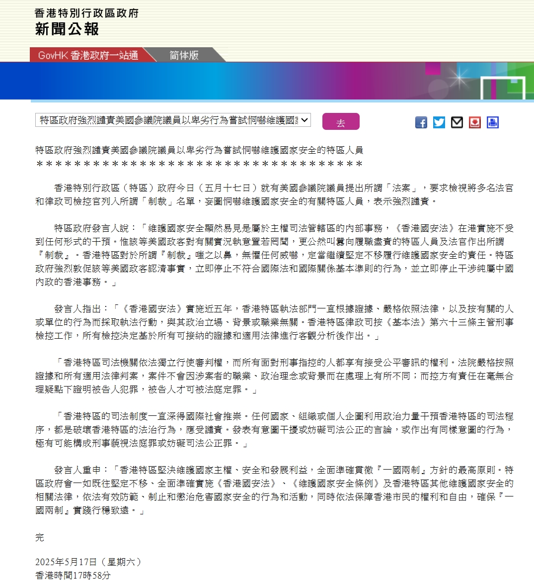 近日,美國參議院議員提出所謂“法案”,企圖將多名香港法官和律政司檢控官列入所謂“制裁”名單,妄圖恫嚇維護國家安全的有關特區人員。香港特別行政區政府5月17日就此表示強烈譴責。