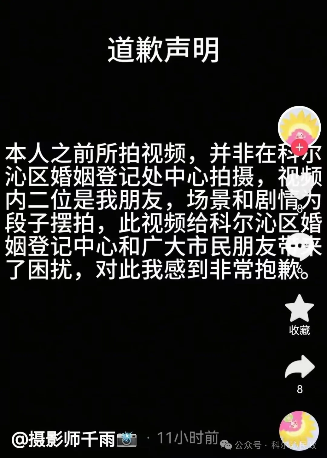 據微信公眾號“內蒙古互聯網違法和不良信息舉報”5月17日消息,近日,一條背景有“通遼市科爾沁區婚姻登記處”字樣的視頻在抖音平台上發佈和傳播,我們通過抖音平台聯繫了當事人。經核實,該條視頻為網名“攝影師千雨”的自媒體博主為吸粉增加流量所發的不實網絡視頻。該博主偽造科爾沁區民政局婚姻登記中心頒證廳場景,視頻中一對新人在頒證廳扭打在一起的情形為博主的朋友擺拍。博主“攝影師千雨”擺拍虛假視頻行為已經造成嚴重負面影響,我們向公安部門報案。目前,博主“攝影師千雨”已刪除原視頻,併發布了致歉聲明。