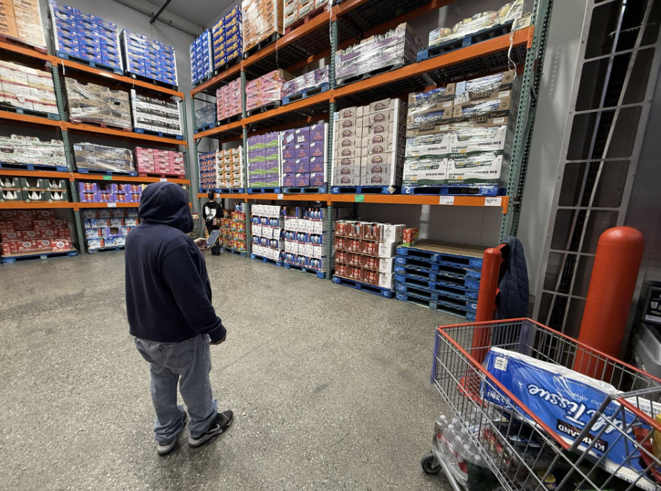 今年2月,在美國加州洛杉磯縣,一名超市顧客面對着空空如也的雞蛋貨架。