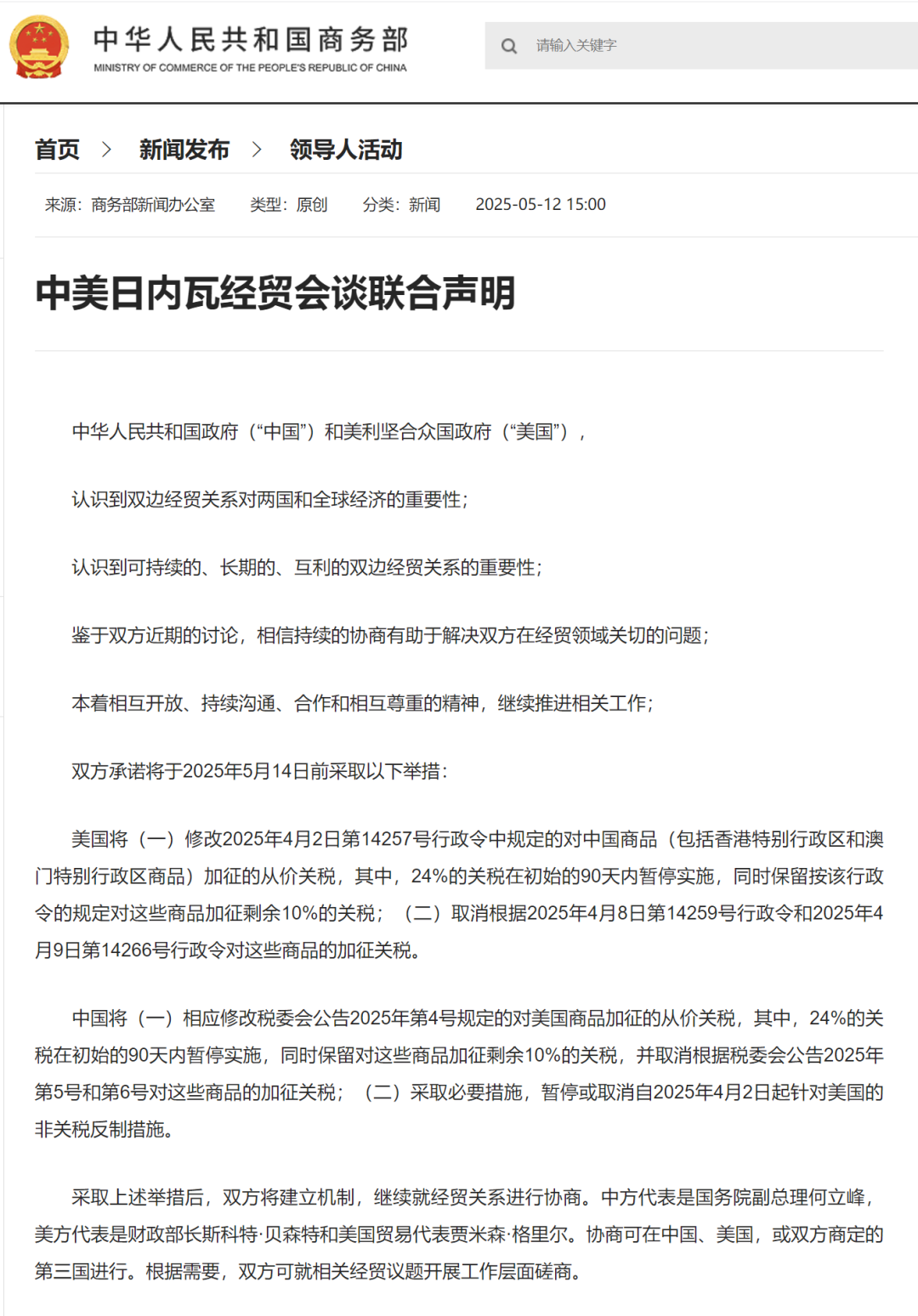 5月12日,中美髮布《中美日內瓦經貿會談聯合聲明》,聲明強調雙方“認識到雙邊經貿關係對兩國和全球經濟的重要性。”雙方同意,取消4月2日以來因美國單方面加徵關税引起的各自互加的關税。