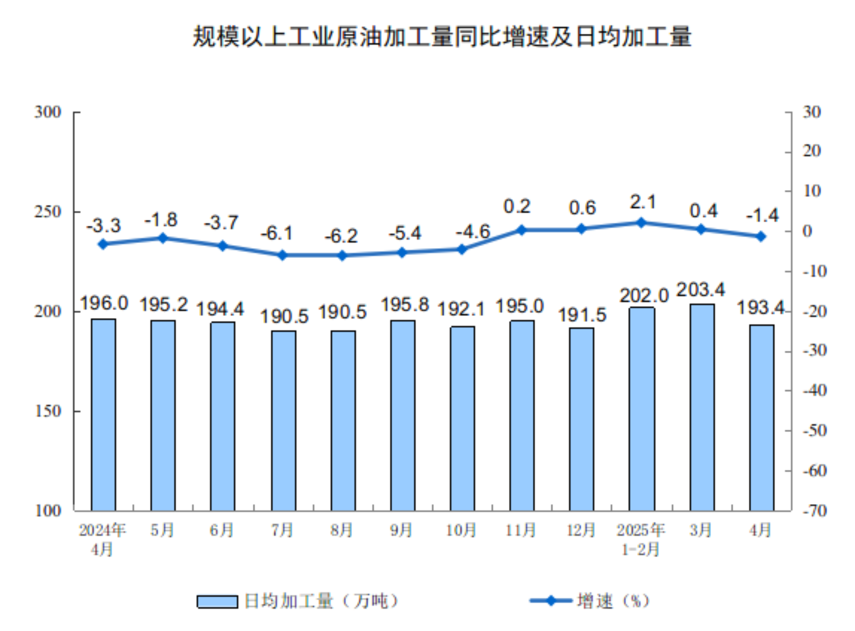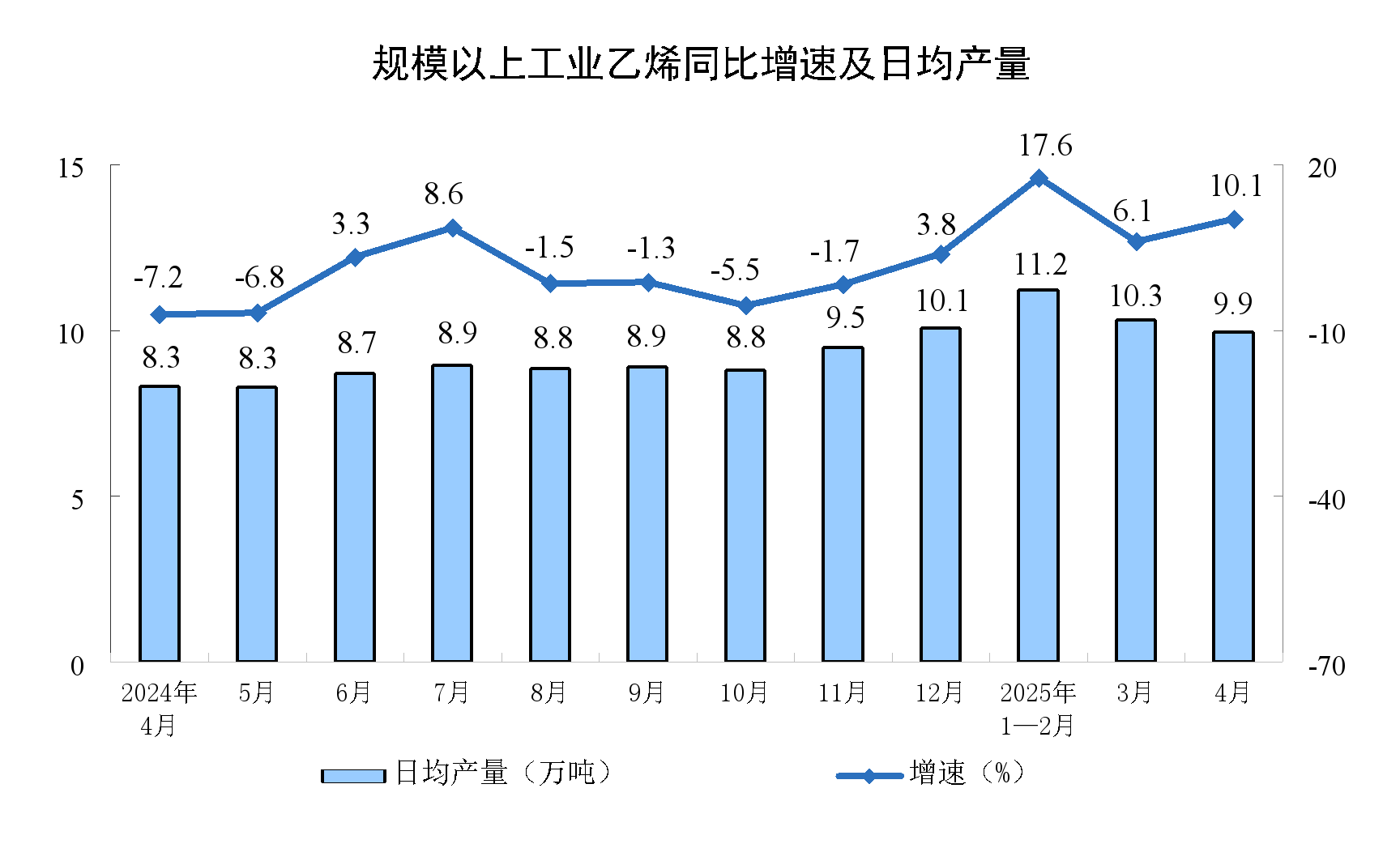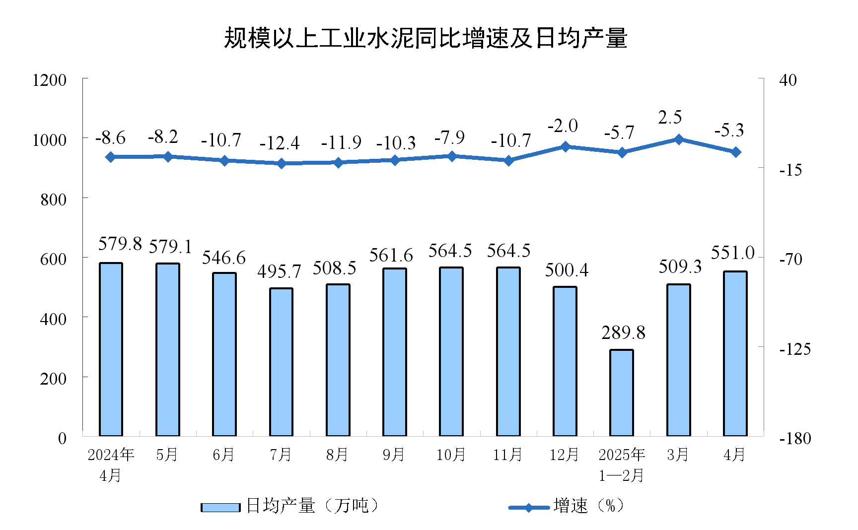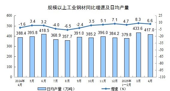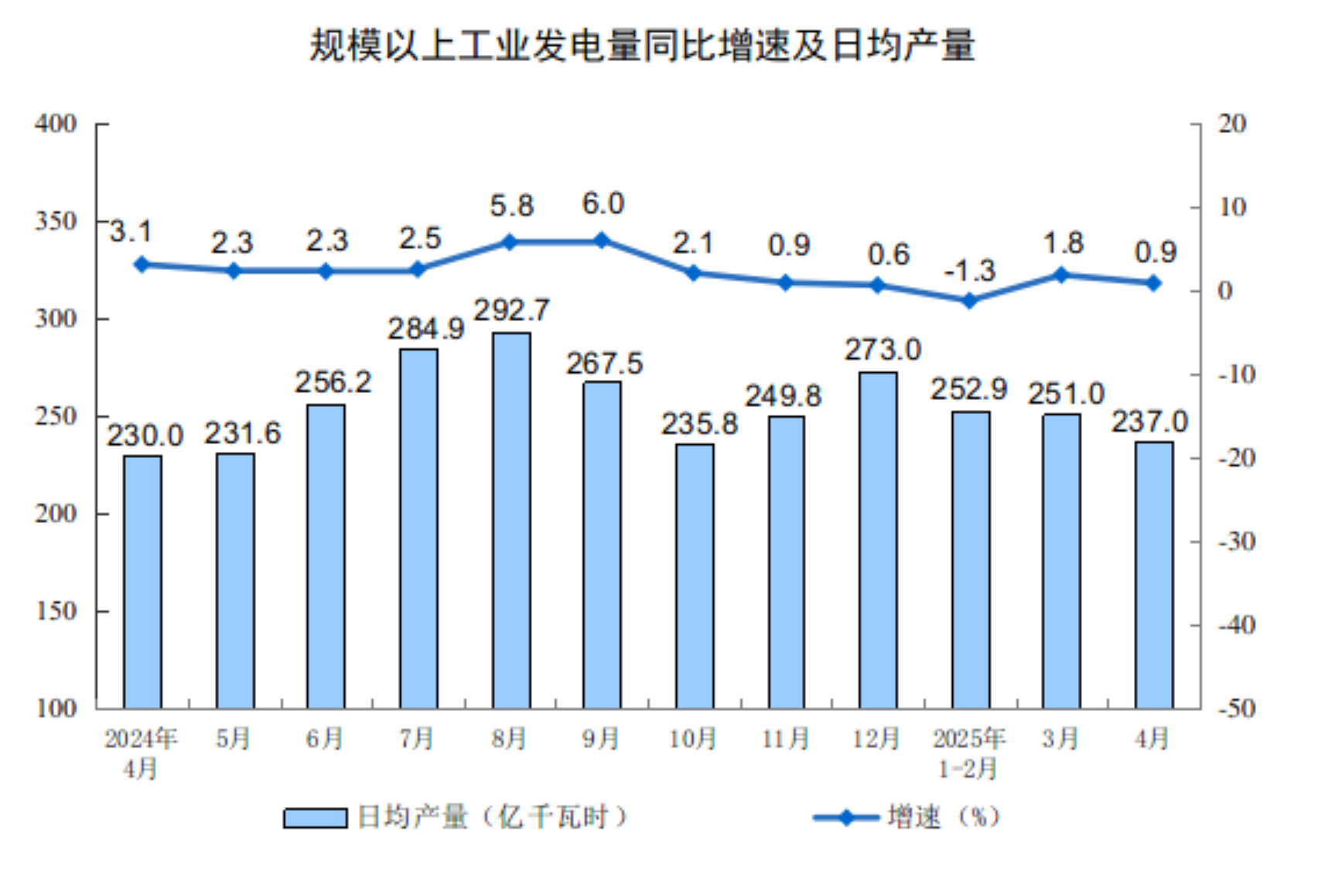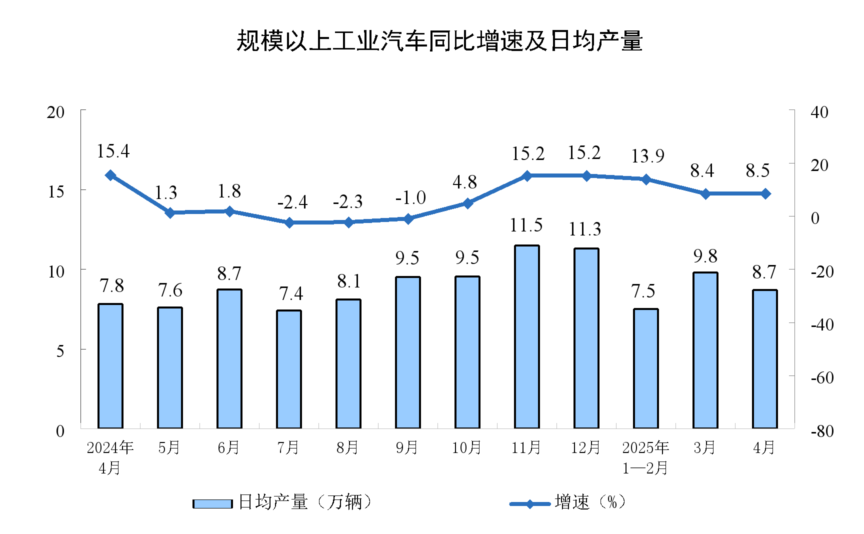 分產品看,4月份,規模以上工業623種產品中有341種產品產量同比增長。其中,鋼材12509萬噸,同比增長6.6%;水泥16530萬噸,下降5.3%;十種有色金屬676萬噸,增長3.1%;乙烯298萬噸,增長10.1%;汽車260.4萬輛,增長8.5%,其中新能源汽車122.8萬輛,增長38.9%;發電量7111億千瓦時,增長0.9%;原油加工量5803萬噸,下降1.4%。
