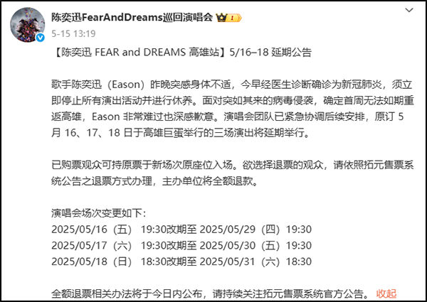 5月15日,@陳奕迅FearAndDreams巡迴演唱會 官方微博發佈消息稱,歌手陳奕迅(Eason)昨晚突感身體不適,今早經醫生診斷確診為新冠肺炎,須立即停止所有演出活動並進行休養。面對突如其來的病毒侵襲,確定首周無法如期重返高雄,Eason 非常難過也深感歉意。演唱會團隊已緊急協調後續安排,原訂 5 月 16、17、18 日於高雄巨蛋舉行的三場演出將延期舉行。