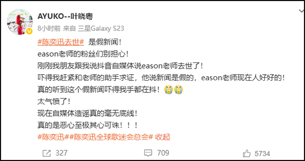 網傳陳奕陳奕迅被傳去世,歌手葉曉粵:假新聞