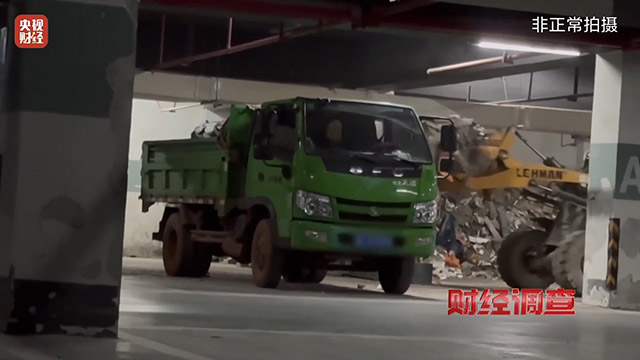 記者在九華湖壹號小區物業指定的建築垃圾堆放點,看見一輛貨車將未分類的建築垃圾裝車、運走。