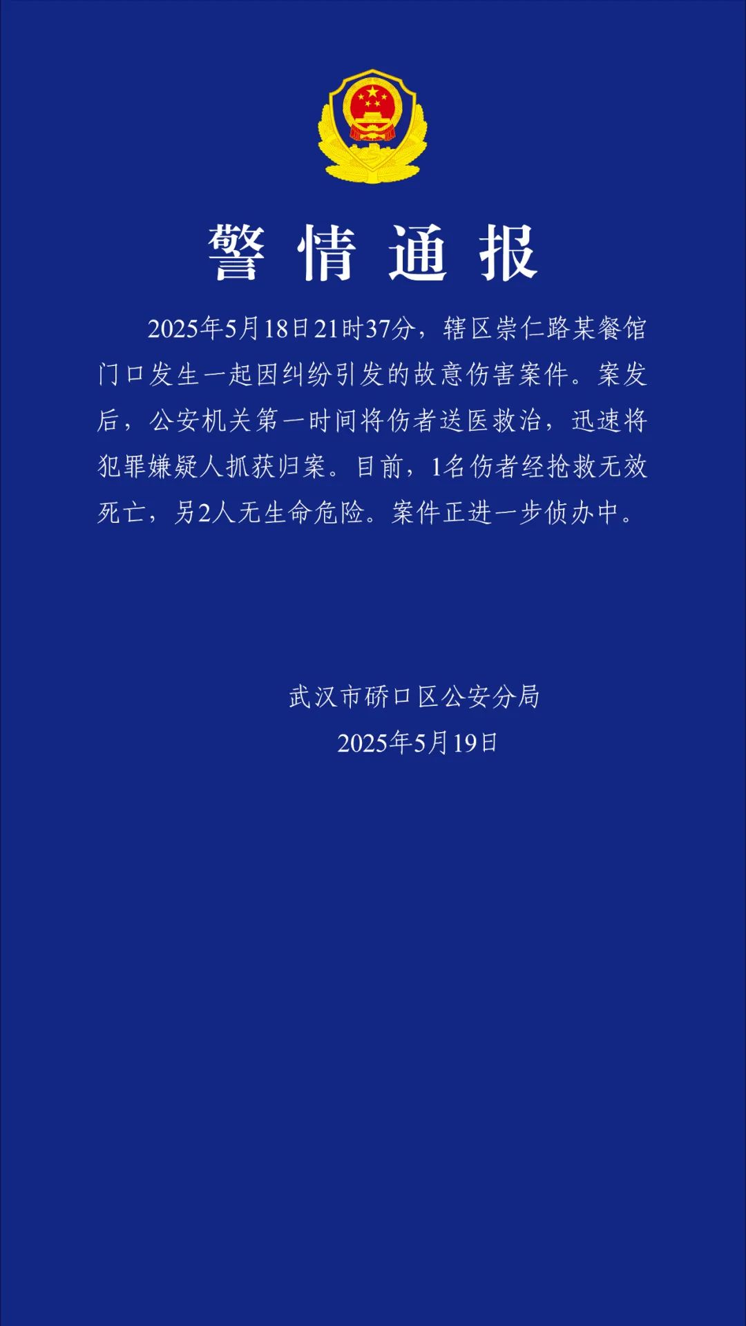 2025年5月18日21時37分,轄區崇仁路某餐館門口發生一起因糾紛引發的故意傷害案件。案發後,公安機關第一時間將傷者送醫救治,迅速將犯罪嫌疑人抓獲歸案。目前,1名傷者經搶救無效死亡,另2人無生命危險。案件正進一步偵辦中。
