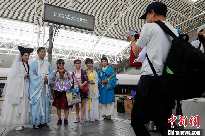 在鐵路上海站站台上,遊客與表演者合影。 中新網記者 殷立勤 攝