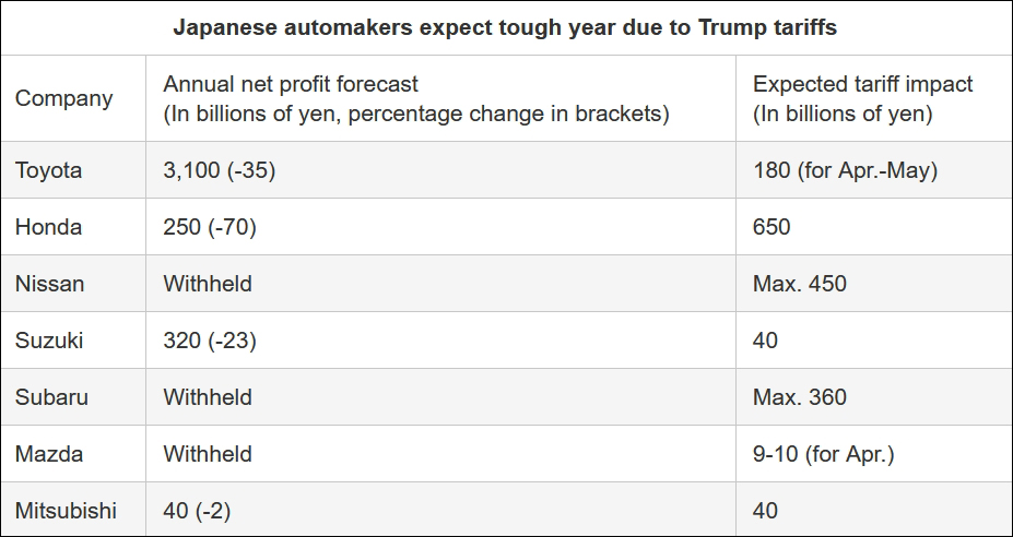日本汽車製造商對截至2026年3月的本財年發佈了悲觀的業績指引,或乾脆取消了財年展望 《日經亞洲》製圖