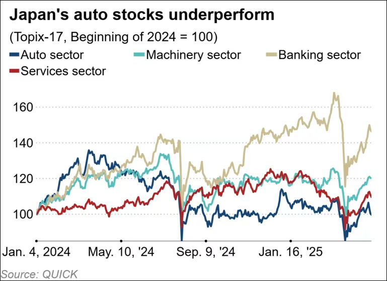 花旗集團日本地區董事兼股票策略主管阪上亮太説:“(美國)25%的汽車關税極可能會繼續存在,這對日本來説是個關鍵問題。”阪上亮太預計,汽車行業帶動的每股收益預期下降“將拖累整個日本股市”,汽車板塊在未來幾個月將跑輸其他行業和整體市場。