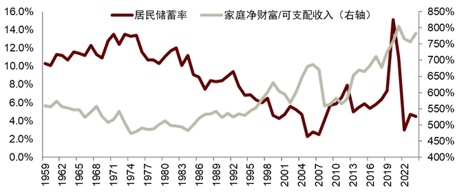 圖表2: 美國居民儲蓄率VS家庭淨財富/可支配收入,數據截至2024年。居民儲蓄率指的是私人儲蓄與可支配收入之比。 FRED,中金研究院