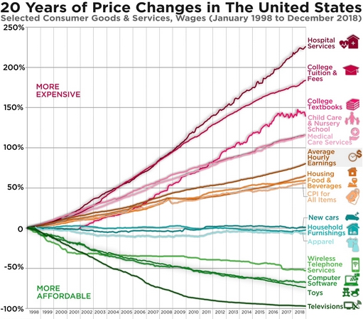圖表展示了從1998年1月到2018年12月美國部分消費品、服務和工資的價格變化情況,手機、電腦、家電等製造業佔經濟的比例呈下降趨勢,而服務業則呈上升趨勢,驗證了鮑莫爾現象