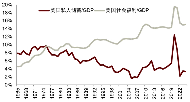 圖表1: 美國私人儲蓄和社會福利支出佔GDP的比重,數據截至2024年FRED,中金研究院