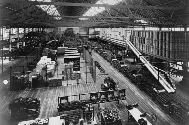 1913年底特律汽車工廠裝配線,但到20世紀70年代至21世紀初,全球化和市場競爭導致了工廠的大規模關閉,最終2013年底特律市政府破產