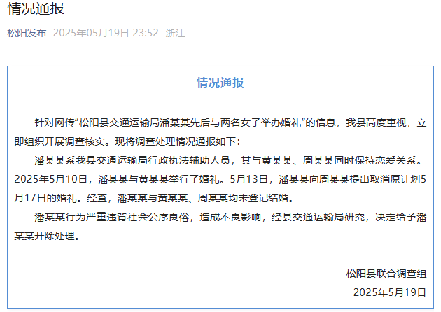 針對網傳“松陽縣交通運輸局潘某某先後與兩名女子舉辦婚禮”的信息,我縣高度重視,立即組織開展調查核實。現將調查處理情況通報如下: