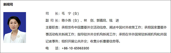 目前,外交部新聞司領導包括:司長毛寧(女),副司長蔣小燕(女)、林劍、郭嘉昆、錢進。