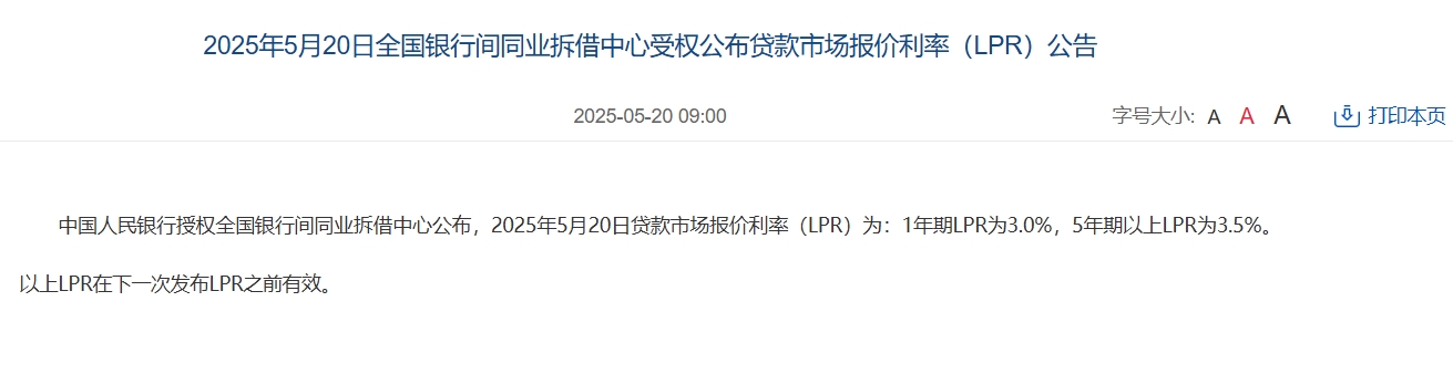 5月20日,中國人民銀行授權全國銀行間同業拆借中心公佈,2024年5月20日貸款市場報價利率(LPR)為:5年期以上LPR為3.5%,上月為3.6%。1年期LPR為3%,上月為3.1%。