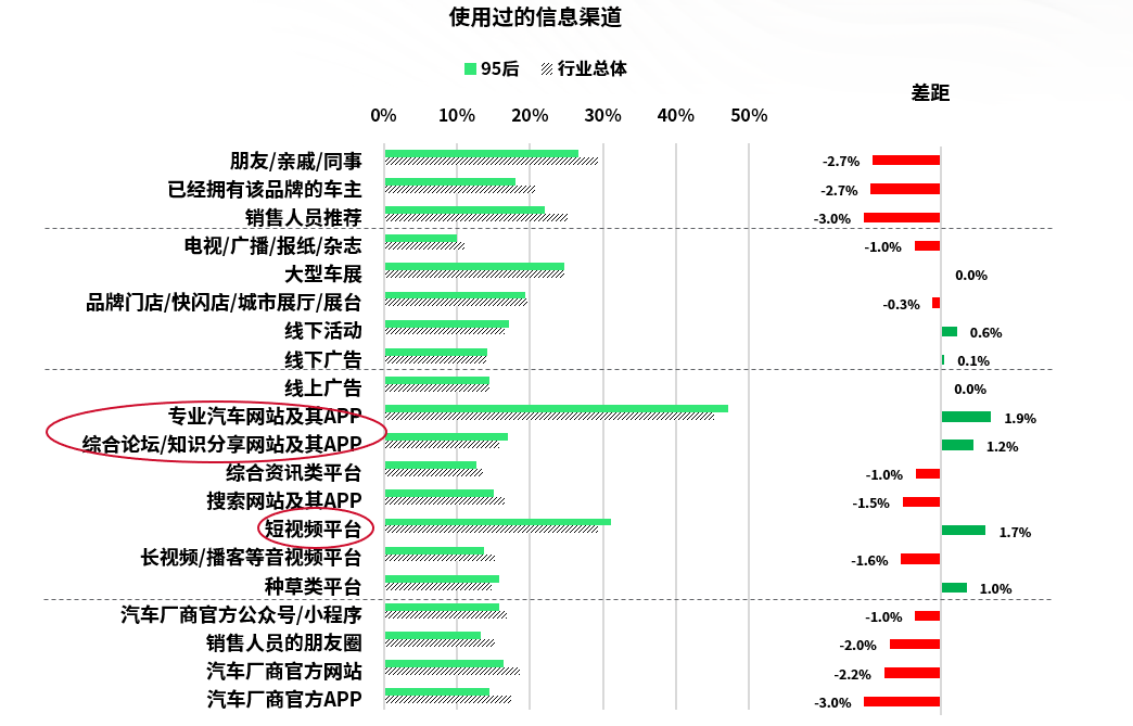 產品信息獲取方面,95後的信息獲取渠道從線下轉至線上,研究顯示,95後對專業汽車網站、短視頻、種草平台的使用率高於其他年齡段,而對品牌官網的使用率則為全人羣最低。