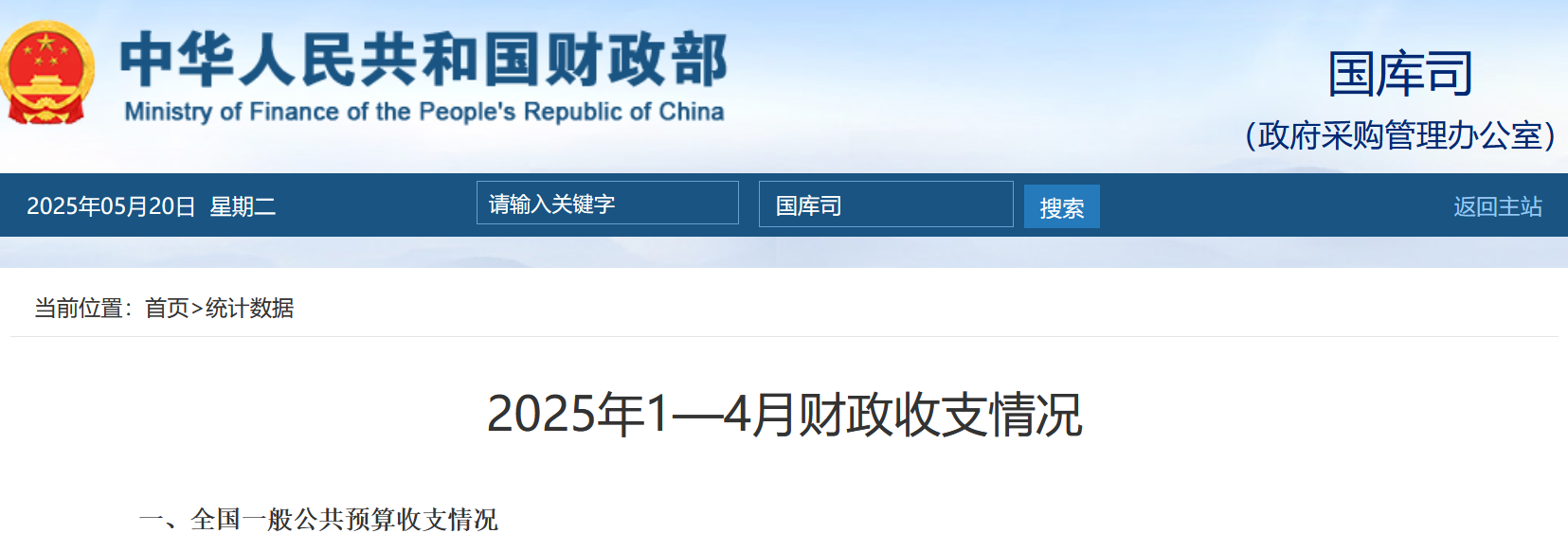 數據顯示,1—4月,全國一般公共預算收入80616億元,同比下降0.4%,降幅比一季度收窄0.7個百分點。