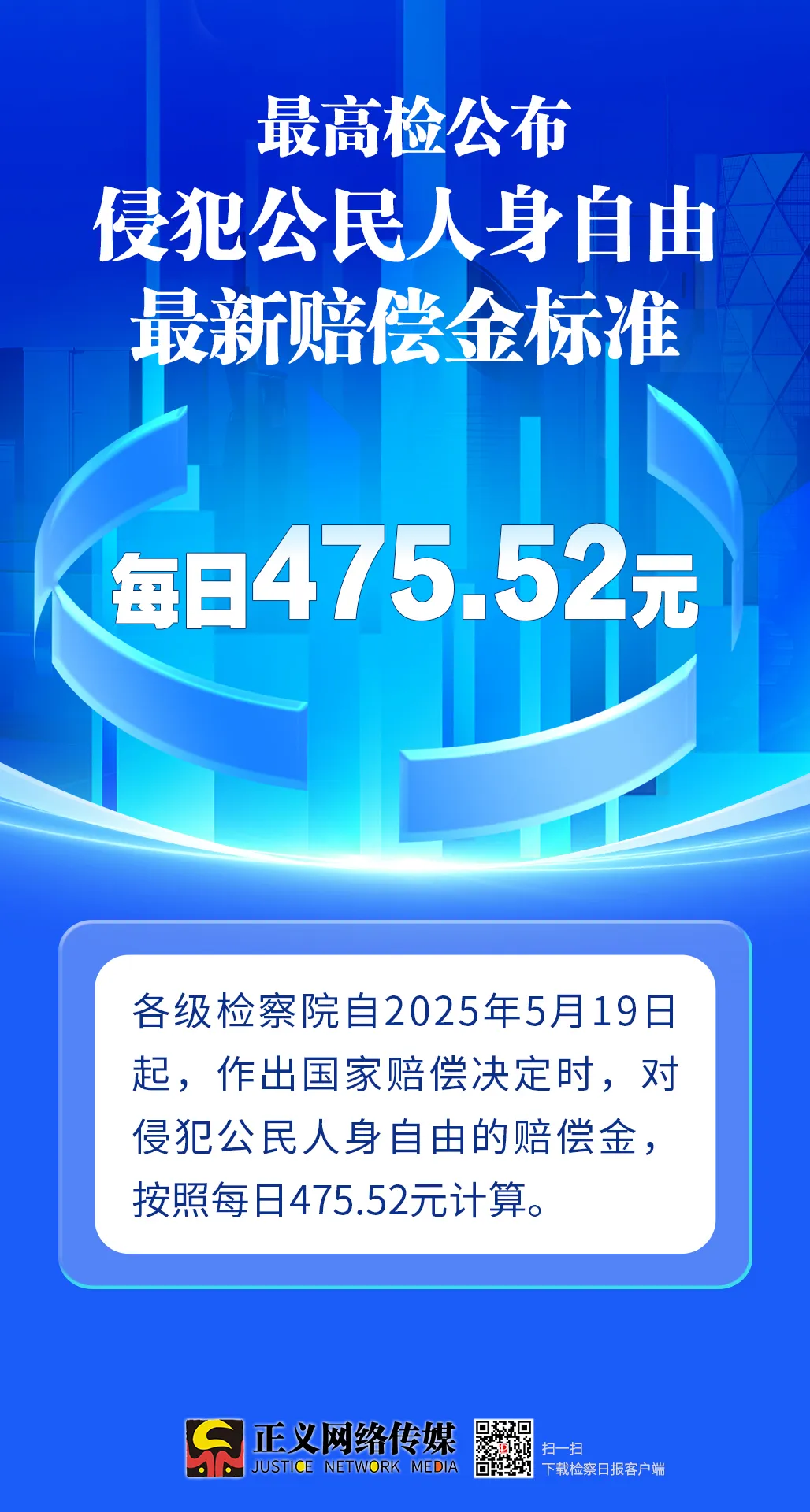 據最高檢控告申訴檢察廳有關負責人介紹,根據國家統計局2025年5月16日公佈的數據,2024年全國城鎮非私營單位就業人員年平均工資為124110元。按照人力資源和社會保障部提供的日平均工資計算公式,日平均工資為475.52元。根據國家賠償法第三十三條和《最高人民法院、最高人民檢察院關於辦理刑事賠償案件適用法律若干問題的解釋》第二十一條第二款規定,各級檢察院自2025年5月19日起,作出國家賠償決定時,對侵犯公民人身自由的賠償金,按照每日475.52元計算。