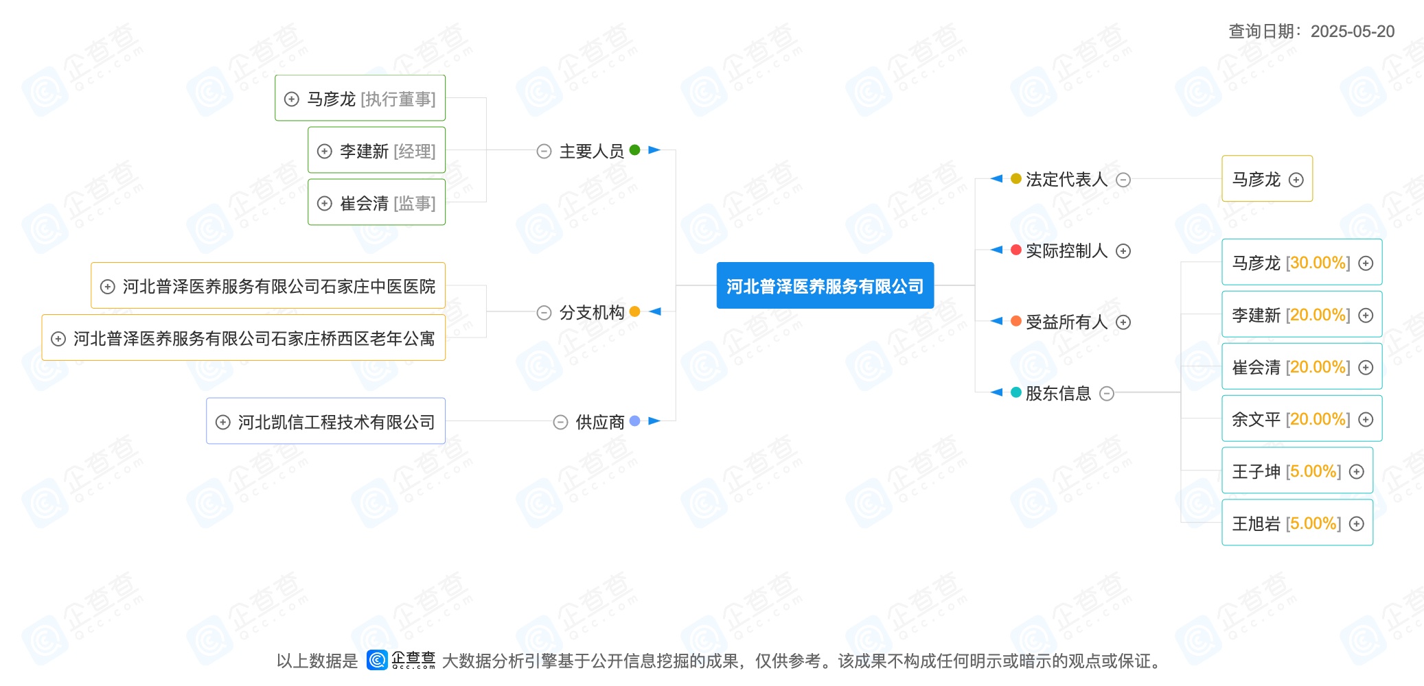 企查查顯示,河北普澤醫養服務有限公司成立於2020年6月,註冊資本2000萬人民幣,法定代表人為馬彥龍。該公司下設河北普澤醫養服務有限公司石家莊中醫醫院和河北普澤醫養服務有限公司石家莊橋西區老年公寓兩家分支機構。馬彥龍名下還關聯了其他3家存續企業,分別是河北普澤醫養服務有限公司、石家莊廣達文化傳播有限公司、河北普澤醫養服務有限公司石家莊橋西區老年公寓。