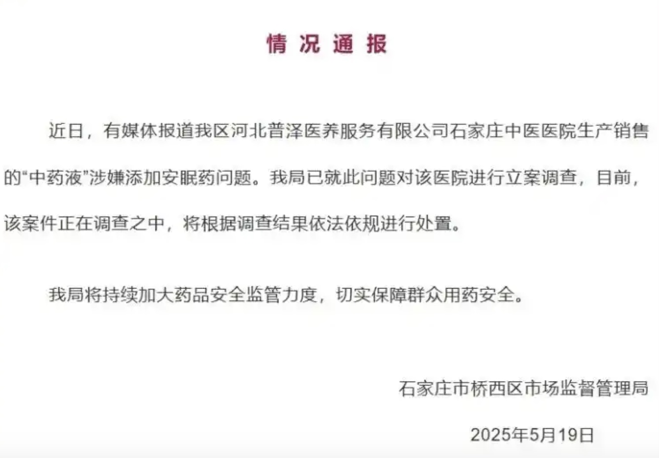 5月19日,石家莊市橋西區市場監督管理局發佈情況通報稱,已就此問題對涉事的普澤中醫院進行立案調查。目前,該案件正在緊鑼密鼓地調查之中,後續將根據調查結果依法依規進行處置。