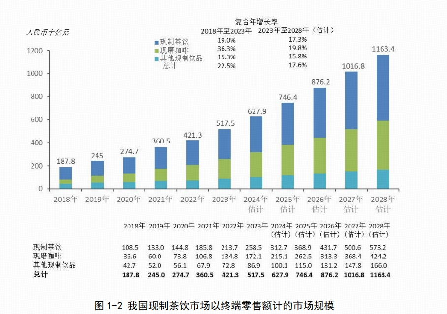 《白皮書》顯示:2023年現製茶飲佔現制飲品市場規模約50%,由2018年的1085億元增加至2023年的2585億元,預計到2028年將按照17.3%的複合年增長率進一步增加至5732億元。
