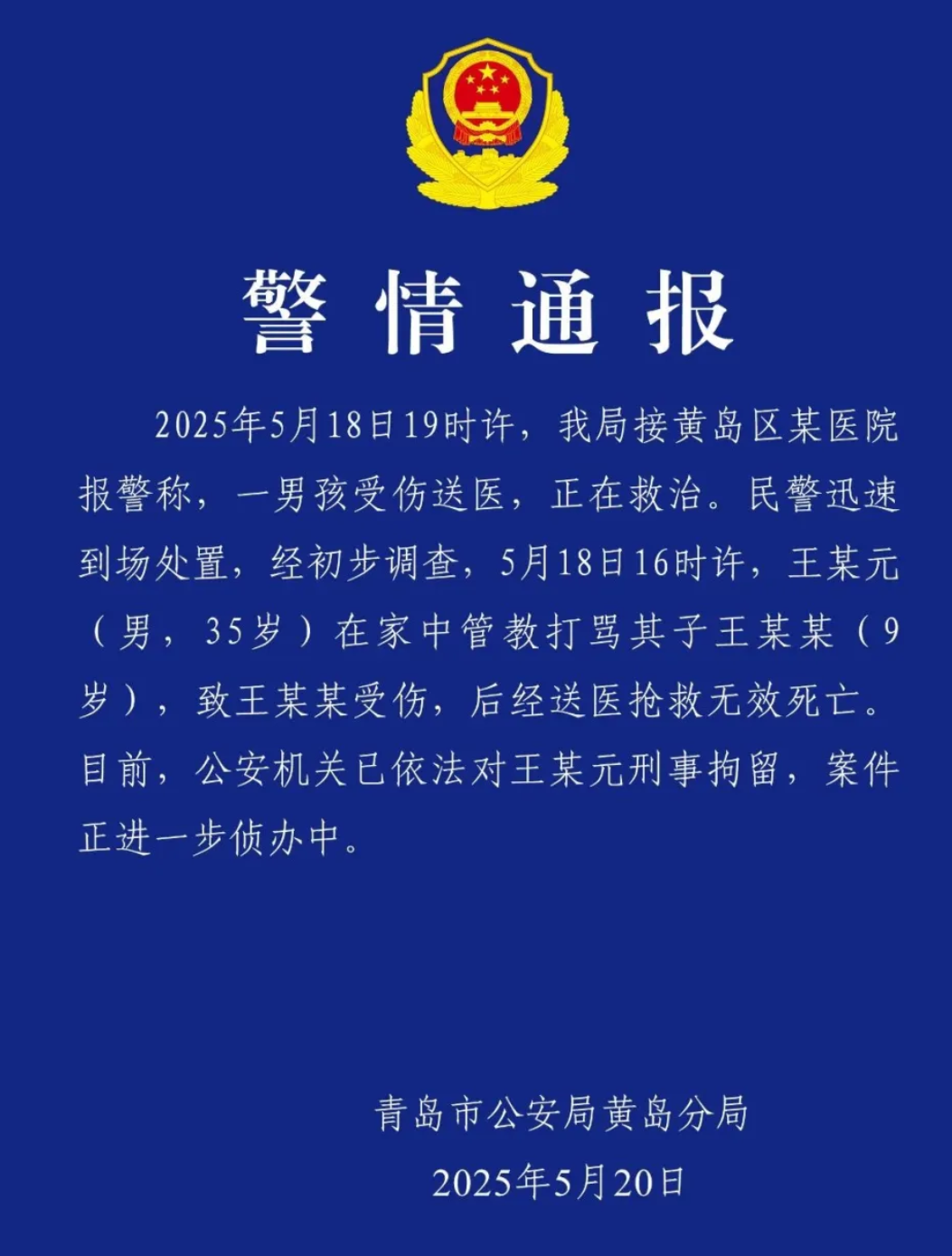 18日19時許,該局接黃島區某醫院報警稱,一男孩受傷送醫,正在救治。民警迅速到場處置,經初步調查,5月18日16時許,王某元(男,35歲)在家中管教打罵其子王某某(9歲),致王某某受傷,後經送醫搶救無效死亡。目前,公安機關已依法對王某元刑事拘留,案件正進一步偵辦中。