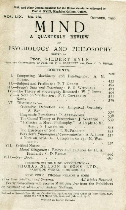 有趣的是這篇《計算機器與智能》的論文並不是發表在科學類雜誌上,而是刊登在心靈學會的季刊《心靈(Mind)—心理學與哲學》上(A. Turing,“Computing Machinery and Intelligence”,《Mind》,59(236):第433-460頁,1950)。