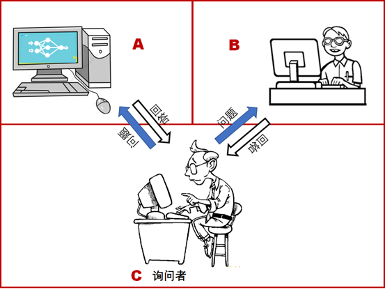 圖靈測試,簡單地説就是讓一個人(詢問者)只通過鍵盤與顯示器與在另外一個與其嚴格隔離的房間裏的“智能體”對話,這個“智能體”可能是一個人,也可能是一台機器。對話內容不限。如果經過一段時間的對話,一台機器給出的回答讓這個詢問者無法確定它是人還是機器,則這台機器便被認為具有了與人一樣的“思考”能力,也就是智能。