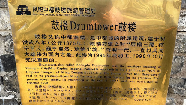 而鳳陽鼓樓銘牌上寫着,鼓樓又稱中都譙樓,是中都城的附屬建築,建於明洪武八年(公元1375年)。原樓初建之時“巍乎翼然,瓊絕塵埃”,終明一代,一直以其高大雄偉為國內之最。“此樓為1995年底動工,1998年10月完成重建的。”