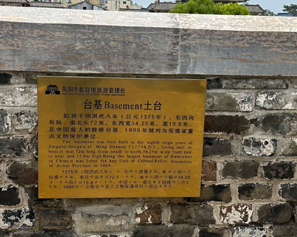 有遊客向澎湃新聞記者提供的一場銘牌照片顯示,台基處單列一個銘牌,顯示(土台)建於明洪武八年(公元1375年),東西向佈局。南北長72米,東西寬34.25米,高15.8米,是中國最大的鼓樓台基。1989年被列為安徽省重點文物保護單位。