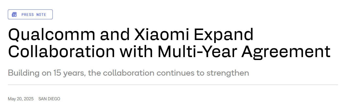 當地時間5月20日,美國高通公司在官網發佈新聞稿稱,該公司與小米公司慶祝合作15週年,並簽署了一份多年期協議。目前這個公告只有英文版,還未見中文公告。