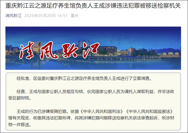 據重慶黔江區紀委監委微信公眾號“清風黔江”5月20日消息,經批准,區監委對重慶黔江雲之源足療養生館負責人王成進行了立案調查。