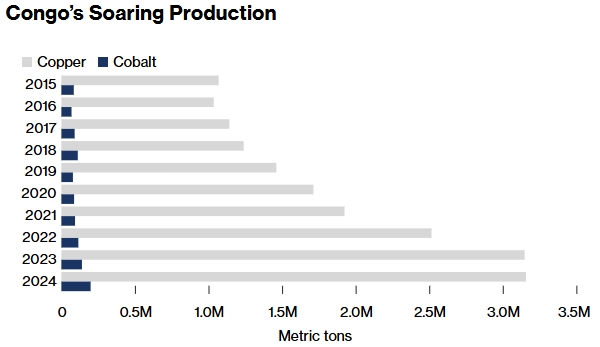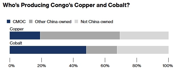 報道援引國際貨幣基金組織的數據稱,銅和鈷的出口,佔剛果(金)國內生產總值的40%左右。2024年,中剛雙邊貿易額接近270億美元,而同期剛美貿易額僅8.2億美元。