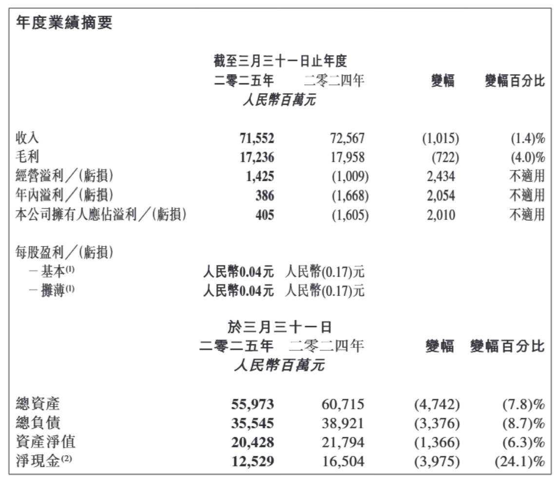 5月20日晚間,大潤發母公司高鑫零售發佈截至3月31日的2025財年業績報告。期內高鑫零售營收715.52億元人民幣,微跌1.4%;當年淨利潤3.86億,同比上財年扭虧為盈。報告同時顯示,其門店數量達到505家,覆蓋207個城市。