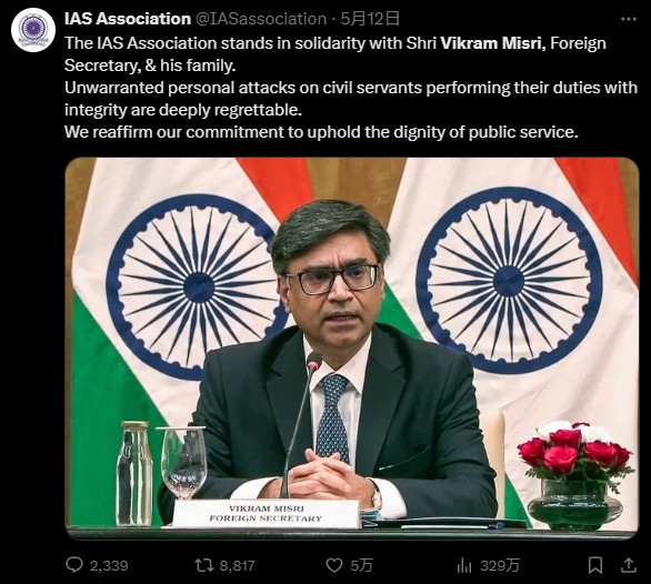 5月12日,印度行政服務局(IAS)發表聲明,稱“對廉潔履行職責的公務員進行無端人身攻擊令人深感遺憾。我們重申維護公共服務尊嚴的承諾。”