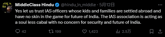 還有人直言:“我們不會相信那些子女和家人定居海外、對印度未來毫無關係的印度行政官員。IAS就像一個沒有靈魂的陰謀集團,對印度的安全和未來毫不關心。”