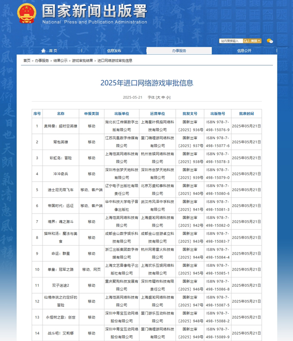 5月21日,國家新聞出版署發佈2025年進口網絡遊戲審批信息,5月共14款進口遊戲獲批。分別為:《奧特曼:超時空英雄》、《揹包英雄》、《彩虹島:冒險》、《沖沖奇兵》、《迪士尼無限飛車》、《帝國時代:遠征》、《境界:魂之激鬥》、《貓咪和湯:魔法與美食》、《命運:羣星》、《拳皇:冠軍之路》、《雙子迷途2》、《仙境傳説之約定好的冒險》、《永恆樹之歌:創世》、《戰鬥吧!艾莉娜》。