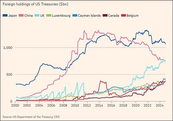 幾大主要美債持有者持有量變化趨勢圖,各顏色代表“債主”從左至右依次為日本、中國、英國、盧森堡、開曼羣島、加拿大、比利時。 《金融時報》製圖