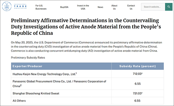 據報道,當地時間5月20日,美國商務部國際貿易管理局網站發佈“對原產於中國的活性陽極材料反補貼調查”的初步裁定公告。其中稱,中國企業從補貼中獲利,兩家中國企業補貼率超過700%,其他中企補貼率為6.55%。